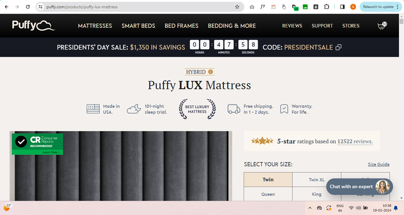 First fold of the page on Puffy Website of all mattresses